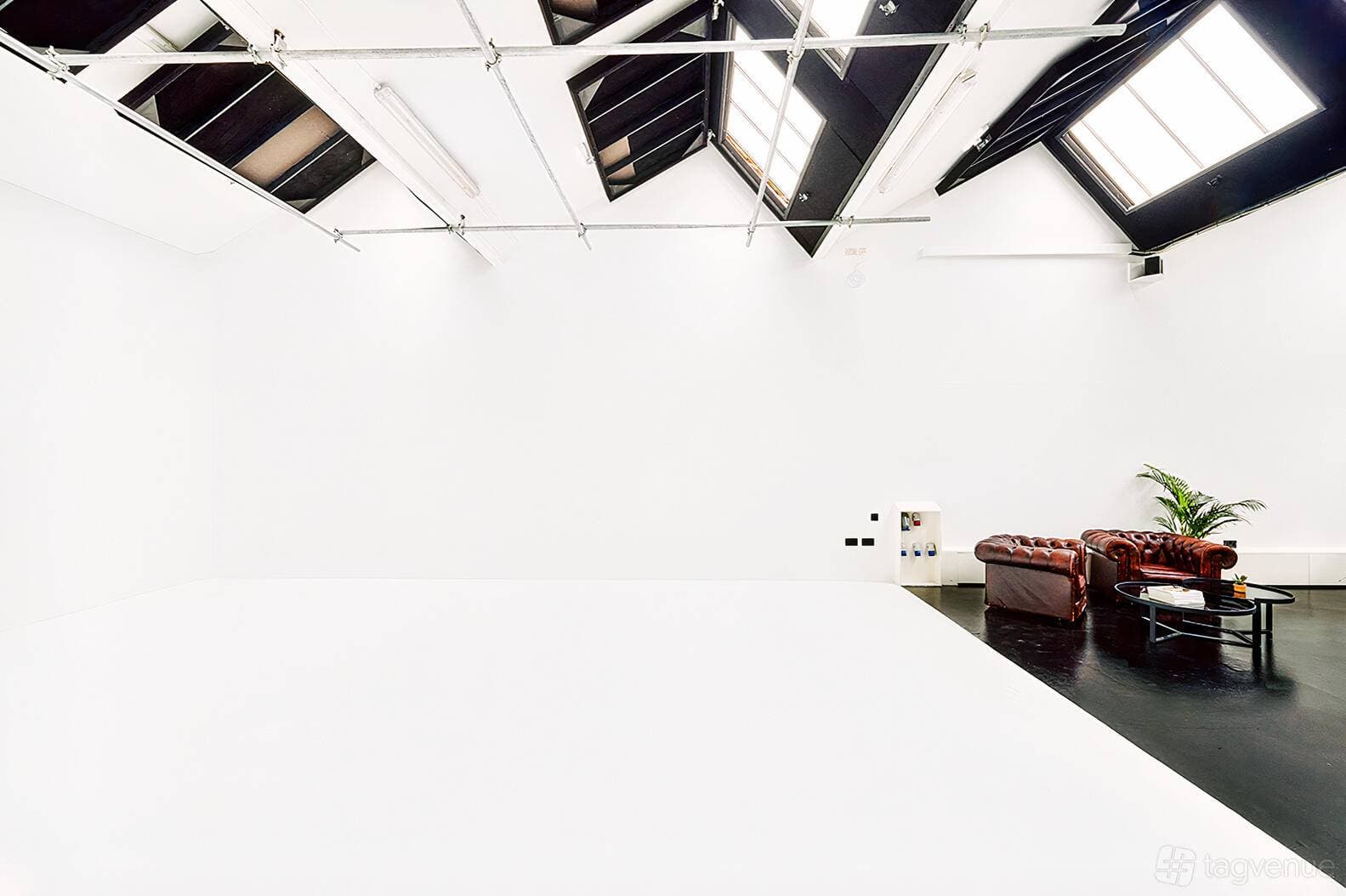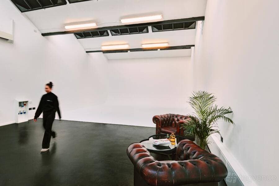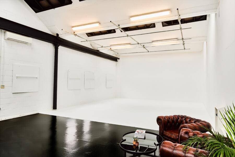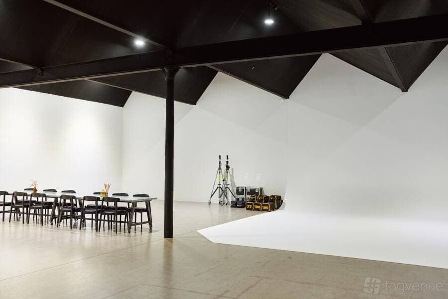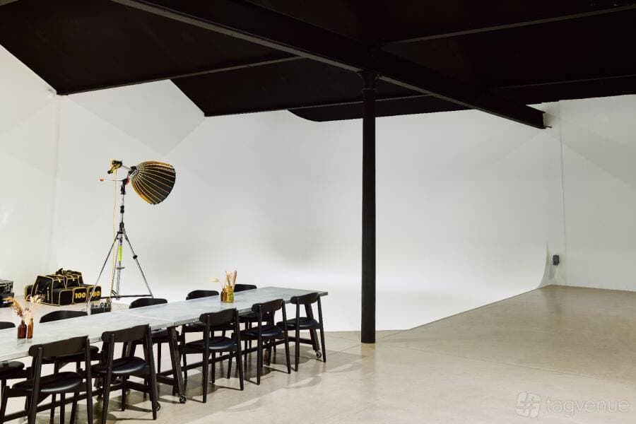 Studio A is a modern, open-concept space with a high-tech visual appearance, accommodating up to 100 guests standing. It is designed for photo and video production, featuring windows and skylights with blackout options, a rolling hair and make-up station, and drive-in access. The space is well suited to a range of professional shoots and production requirements.