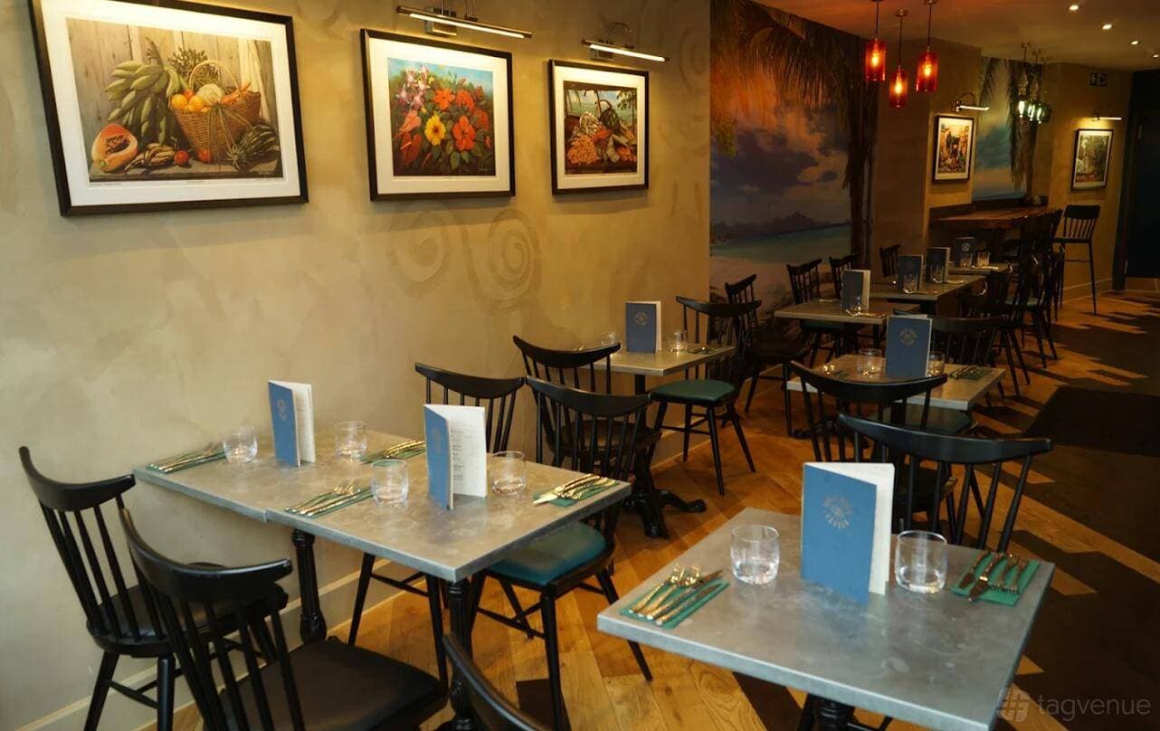 The Dining Room is the venue's main bookable space, designed to evoke a Caribbean environment. It accommodates up to 60 guests standing, making it suitable for receptions, private dining events, and group gatherings. The space includes a bar and access to a terrace.