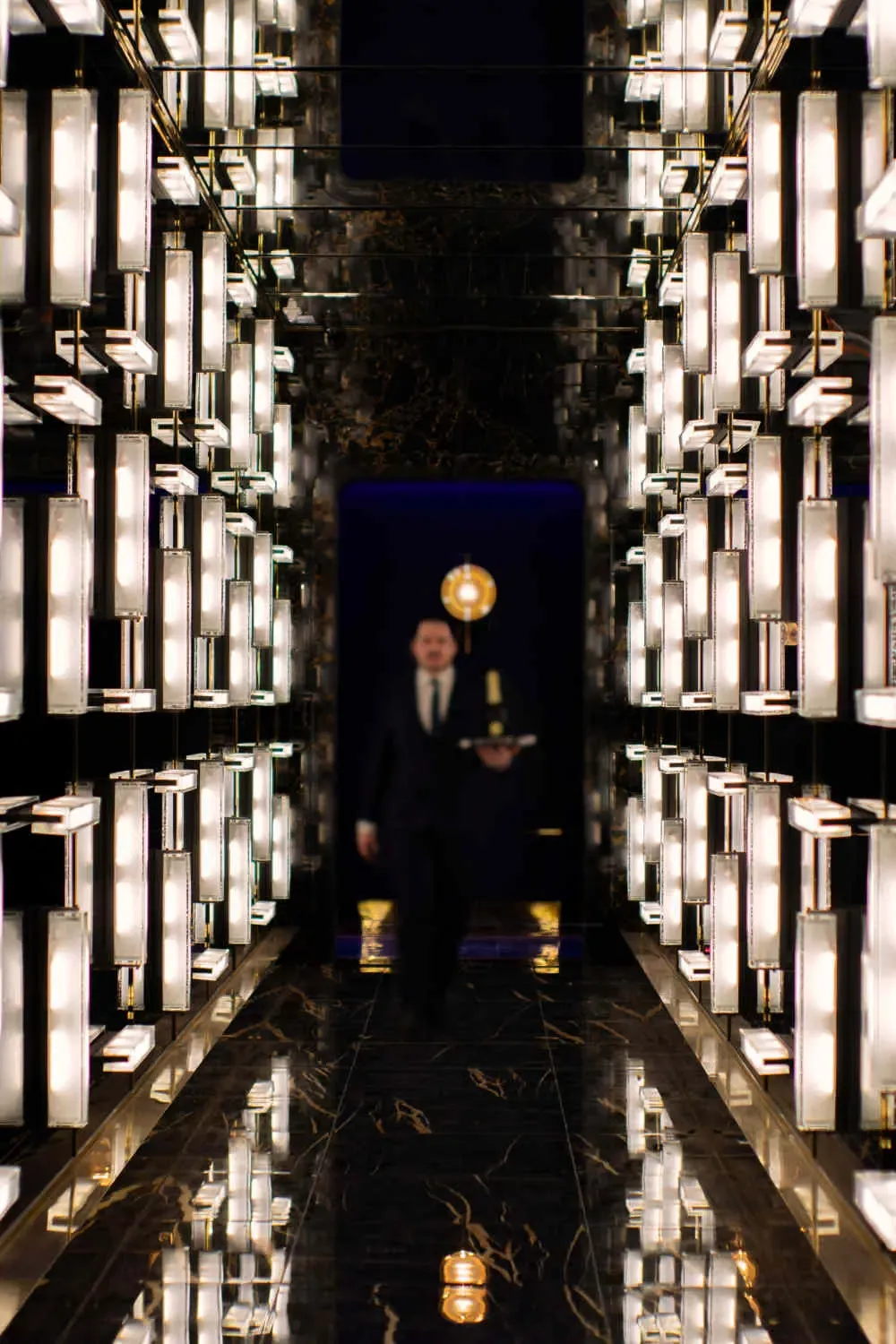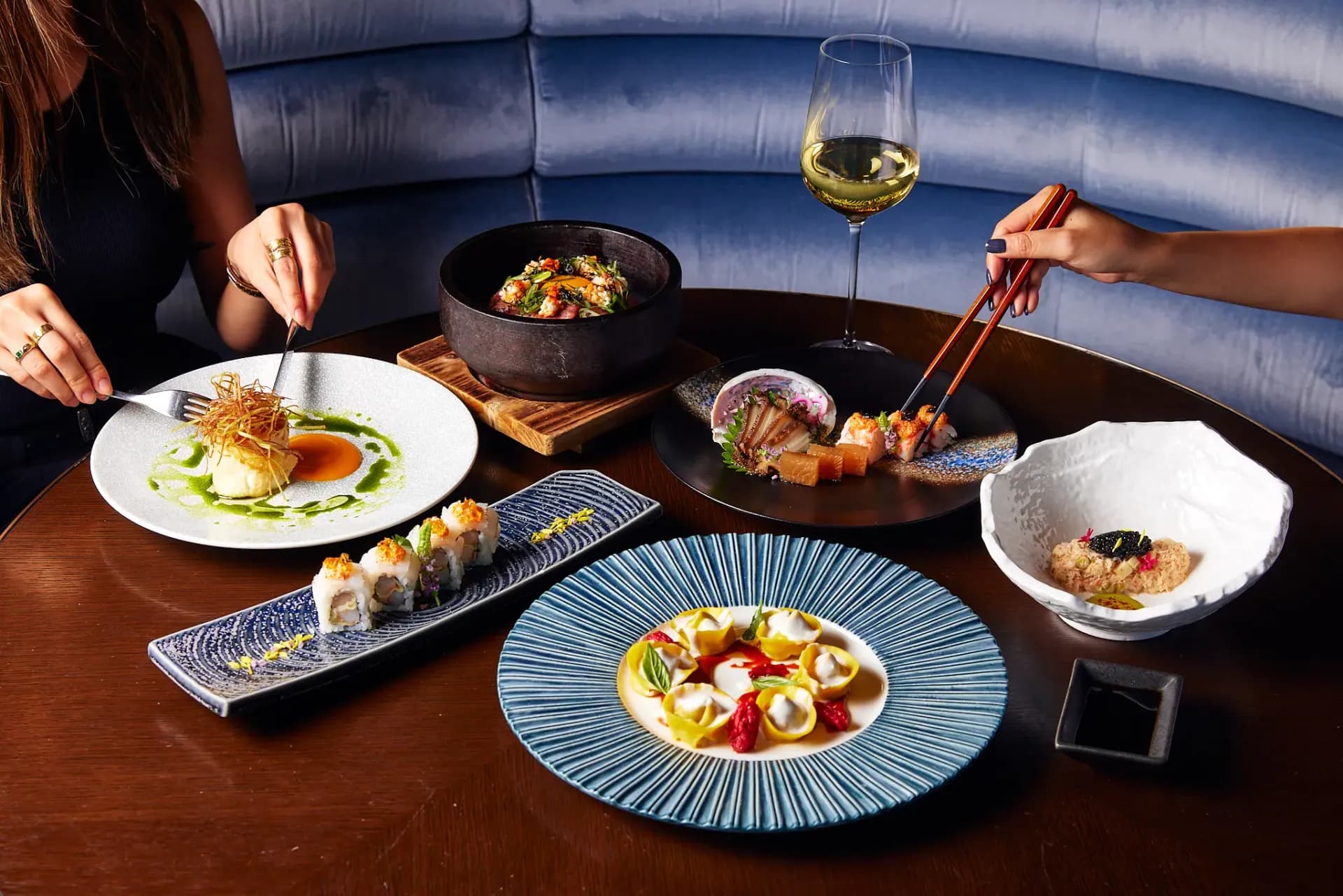 The atmosphere is dramatic, sleek, and glamorous, with polished and celebratory moods suitable for date nights, business dinners, drinks, and large-scale events. The cuisine blends contemporary Italian and Japanese dishes from separate kitchens, including handmade pasta, burrata, wood-fired pizza, sushi, sashimi, robata dishes, and tasting menus. Signature specialties include lobster linguine, duck ravioli del plin, black truffle tagliolini, premium o-toro sashimi, saikyo miso black cod, stone-grilled wagyu beef, and wood-fired pizzas with Parma ham.
