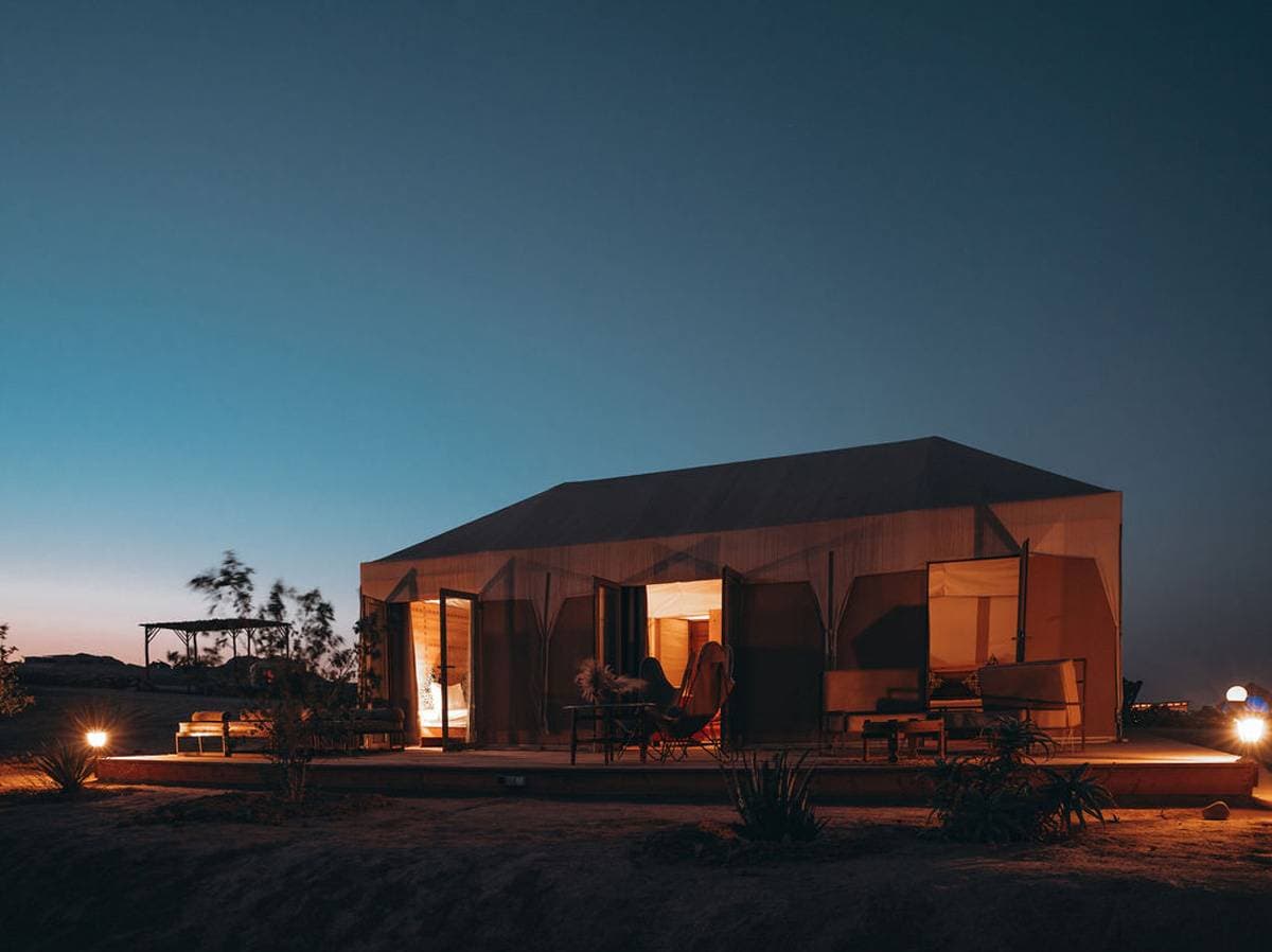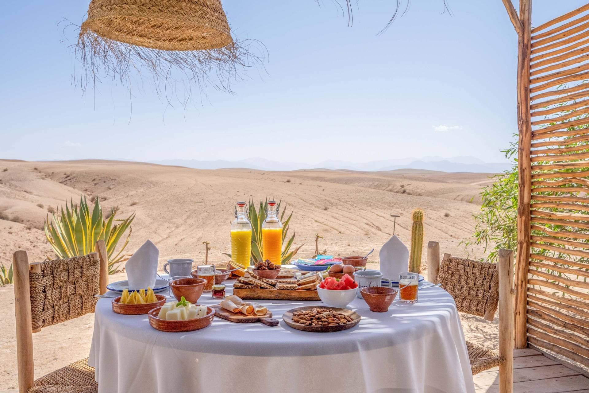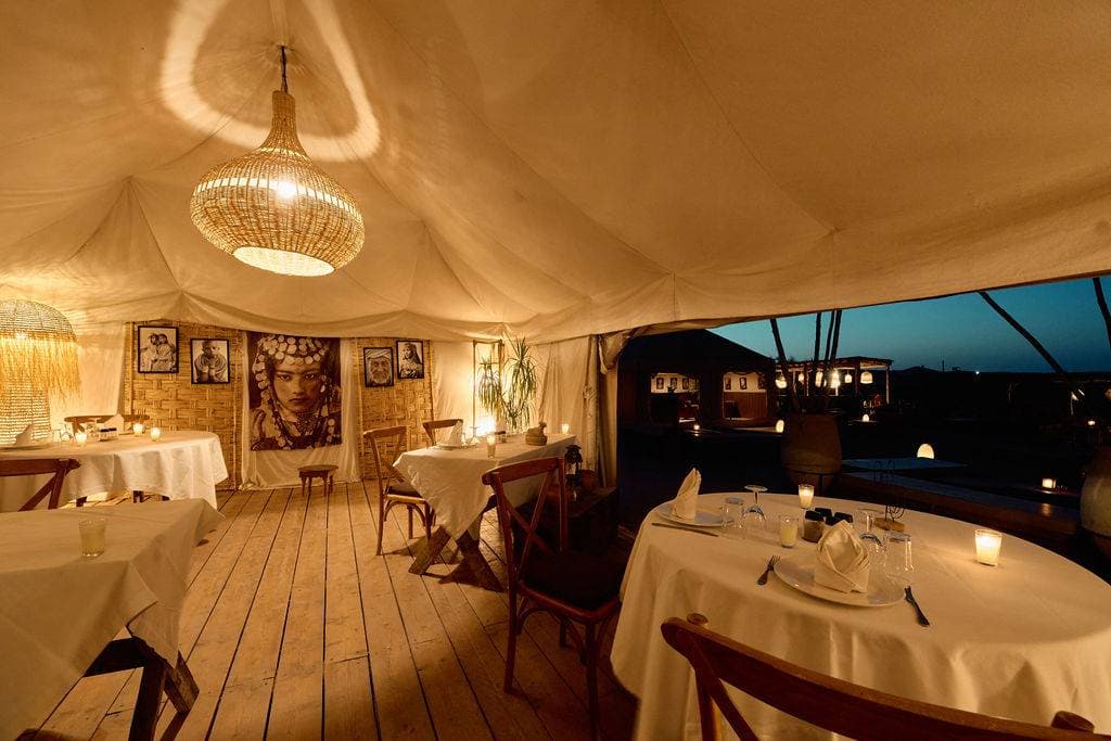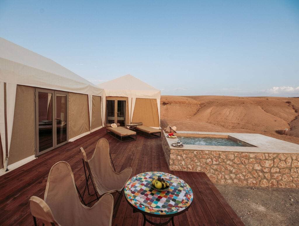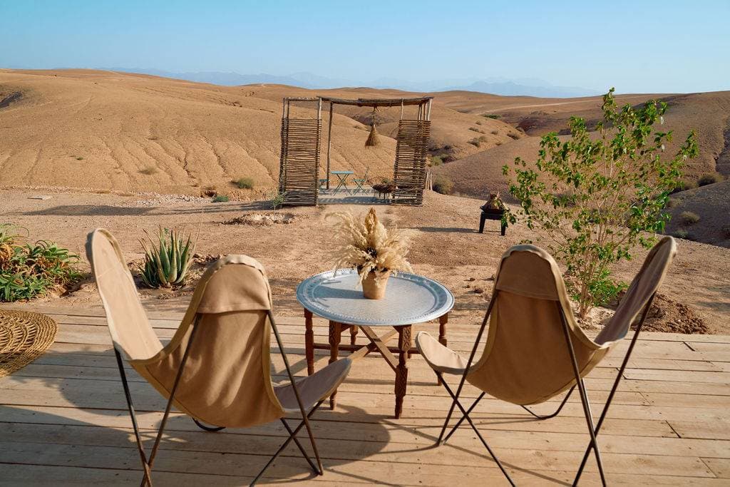 Located in the heart of the Agafay desert, this establishment offers an unforgettable glamping experience, combining modern comfort with immersion in nature. Opened in 2016, it stands out for its peaceful setting, surrounded by majestic mountains and breathtaking starry skies. With 19 carefully decorated luxury tents, each space is equipped with comfortable beds, Egyptian cotton sheets, and private bathrooms with hot showers, ensuring a unique experience in harmony with the environment. Guests can relax by the pool while enjoying stunning views of the surrounding mountains or savor exquisite dishes in the gourmet restaurant, where a talented chef uses fresh local ingredients to create delicious meals. This venue is ideal for business stays, offering a variety of activities such as hiking, horseback riding, camel trekking, and evenings under the stars. The warm and welcoming staff is dedicated to making every stay memorable, making this place a preferred choice for corporate events.