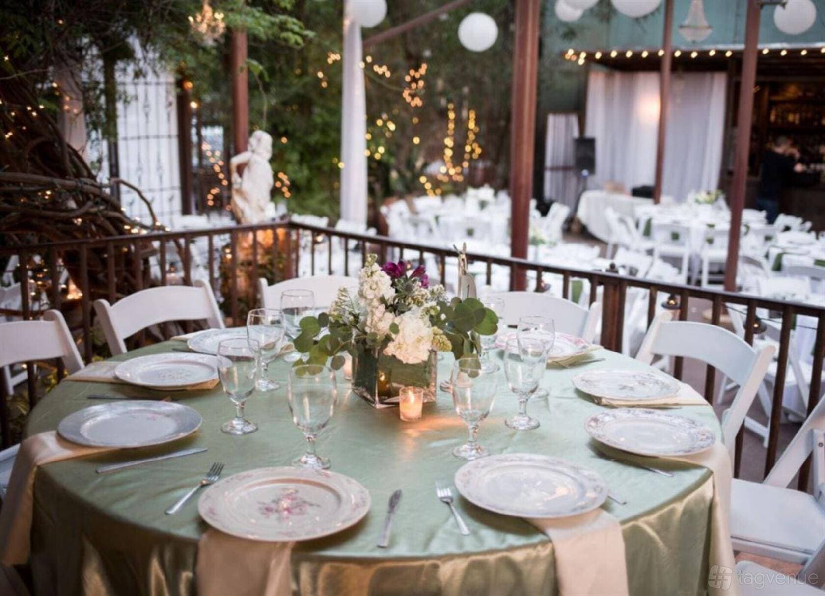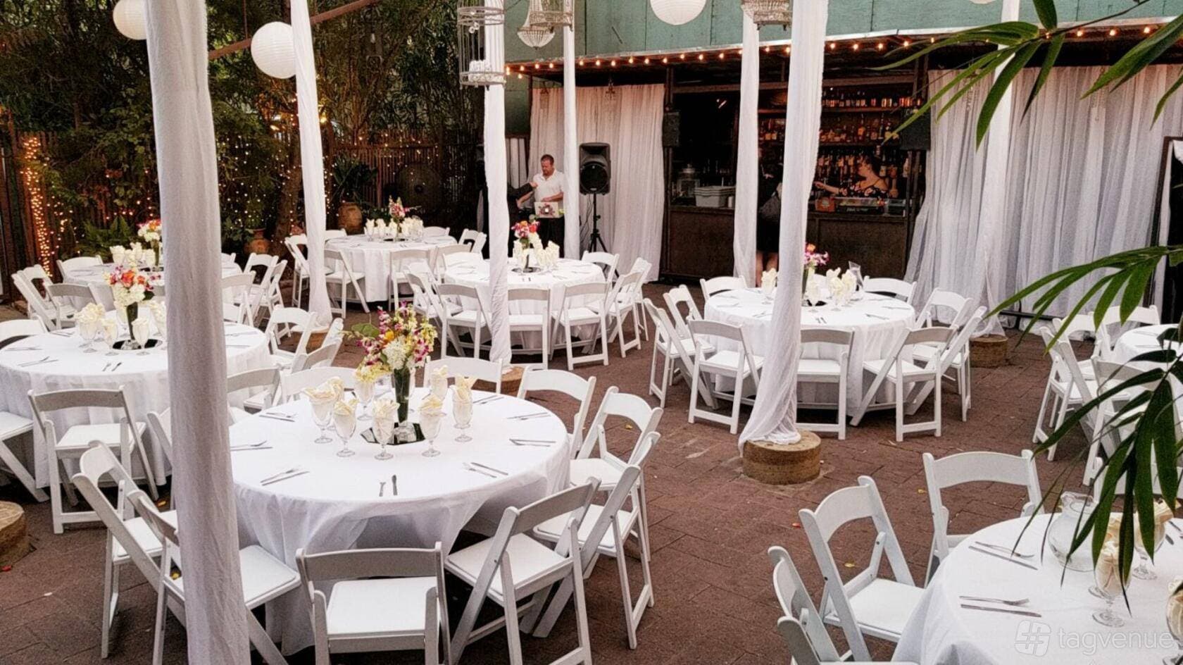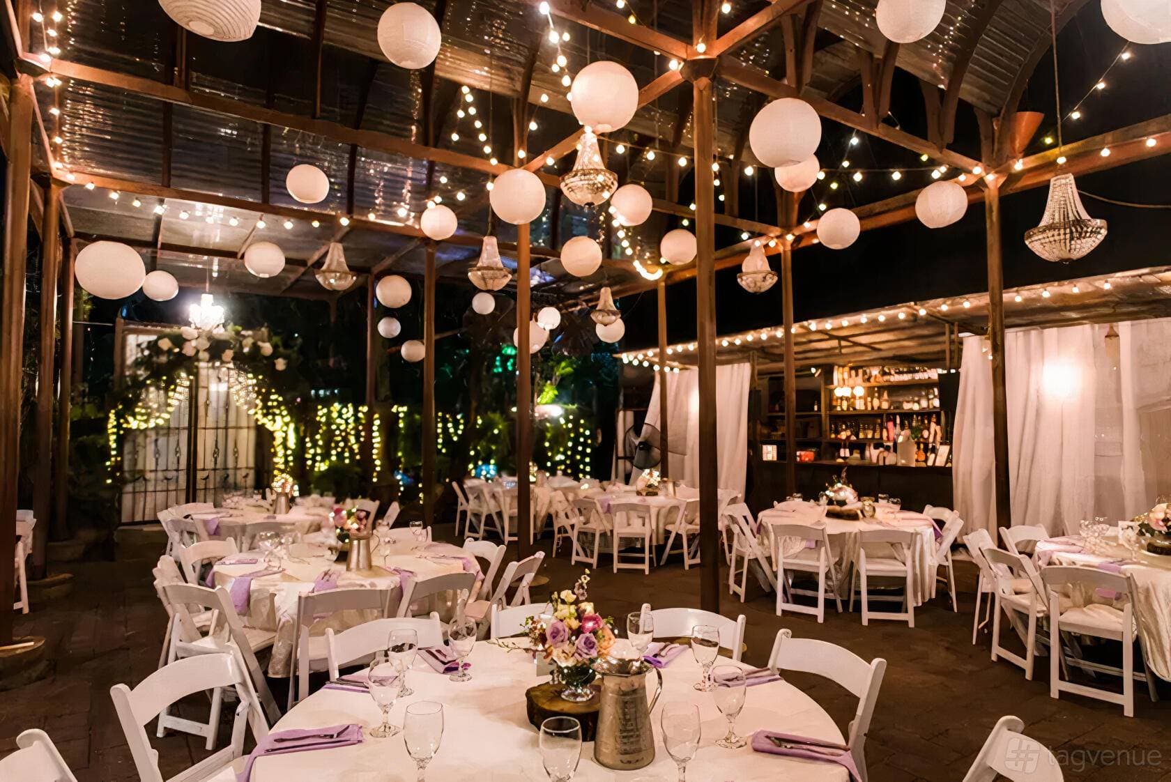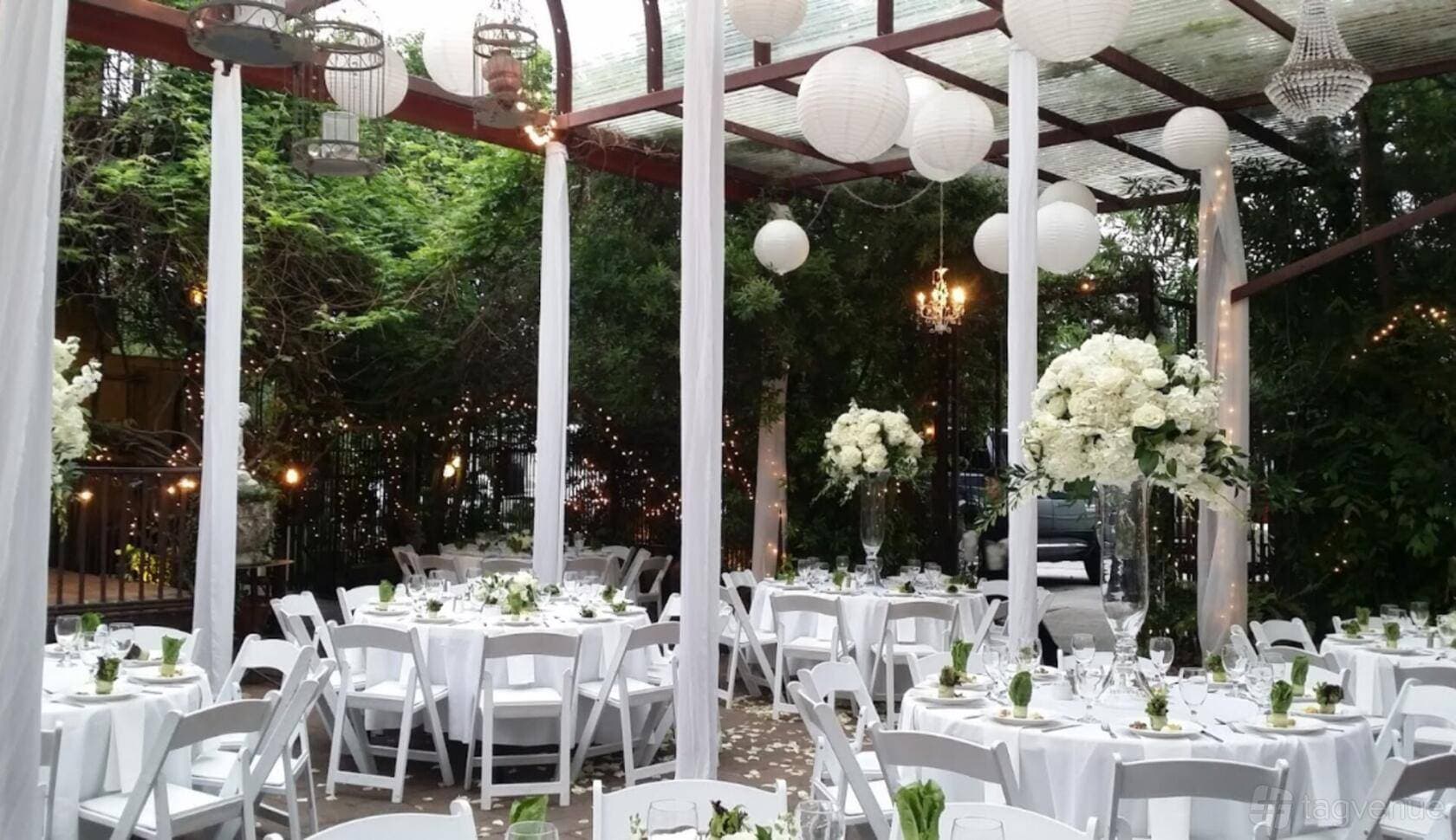 The Outdoor Space is a private terrace that can accommodate up to 150 seated guests or 200 standing. Dressed with string lights and lush garden surroundings, this space is well suited for weddings, birthday parties, and large social gatherings.
