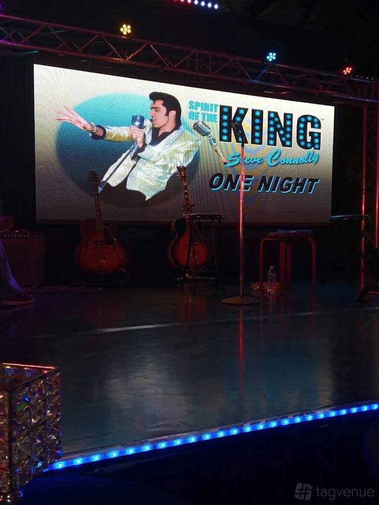 The venue features a built-in stage, theatre-style seating, a large digital screen, a glittering backdrop, and professional stage lighting. Its clean, modern design lends itself to both creative productions and structured corporate formats.
