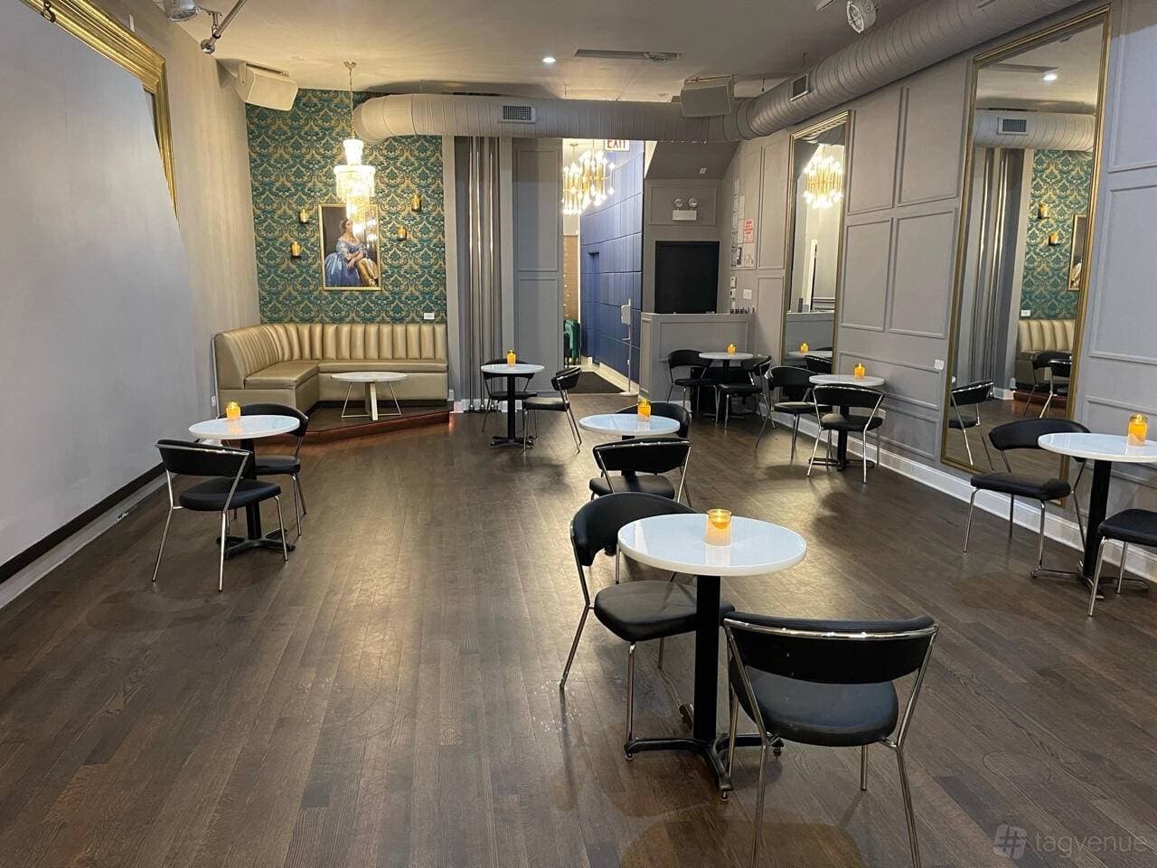 The Lounge & Bar is the venue's private event space, accommodating up to 80 guests seated or up to 90 standing. The room features round tables, candles, and chandeliers, set beneath atmospheric stage lighting. A dedicated stage ensures clear sightlines for performances. On Thursday, Friday, and Saturday evenings, the lounge hosts a rotating cast of performers — including aerial artists and dancers — creating an immersive, theatrical atmosphere. The space is well-suited to private parties, nightlife events, and entertainment-focused gatherings.