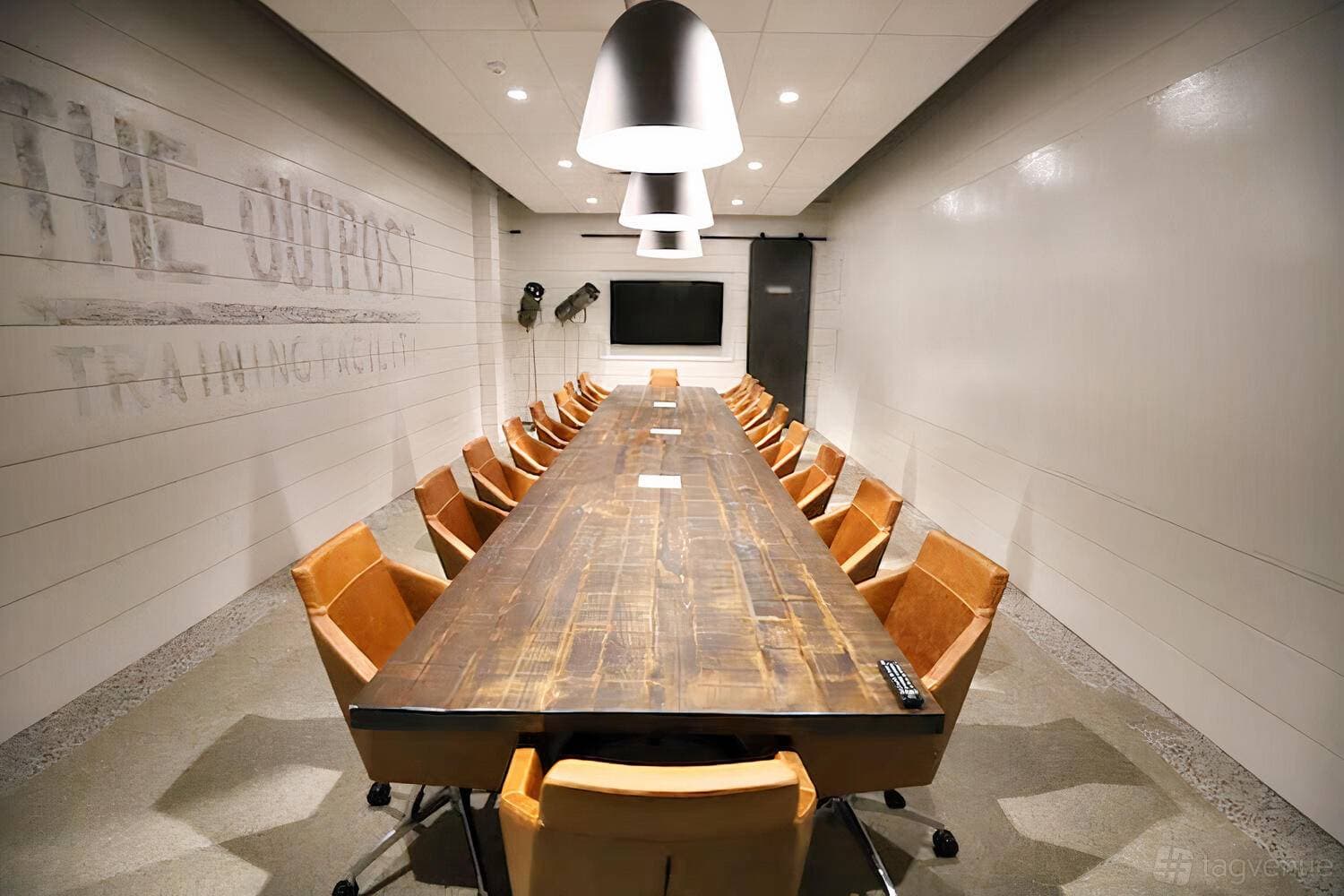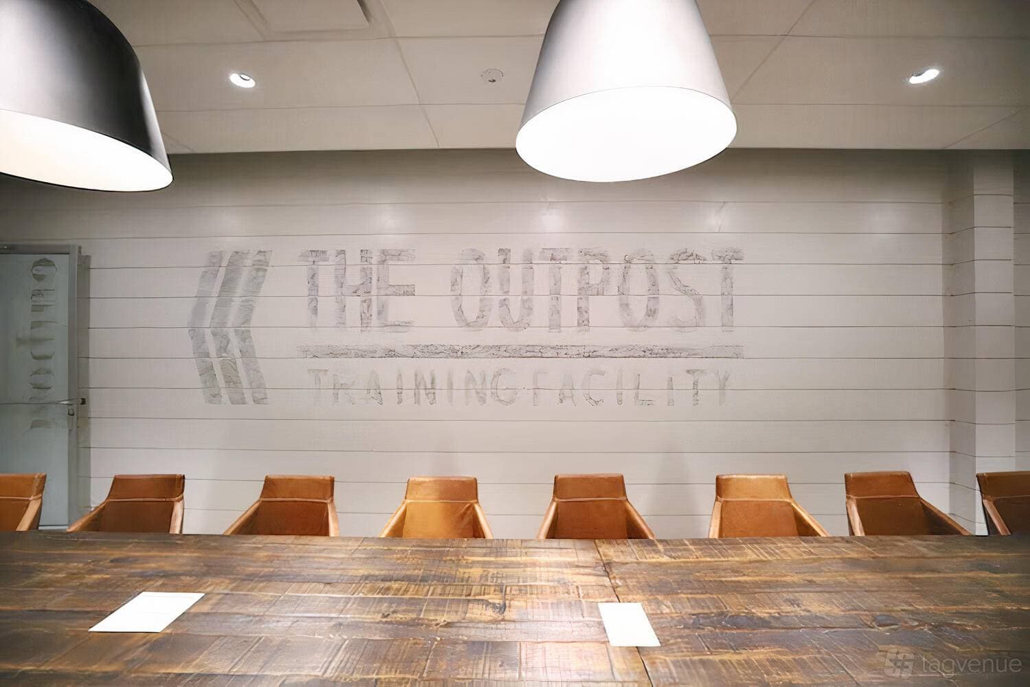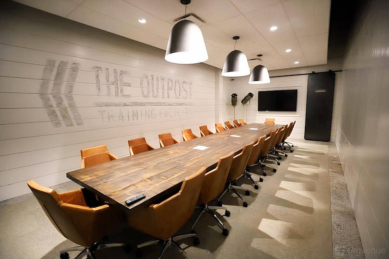 The Outpost is a private boardroom-style space accommodating up to 20 people. Distinguished by shiplap walls and military-inspired decor, it is suited for high-stakes meetings, strategic discussions, and client presentations.