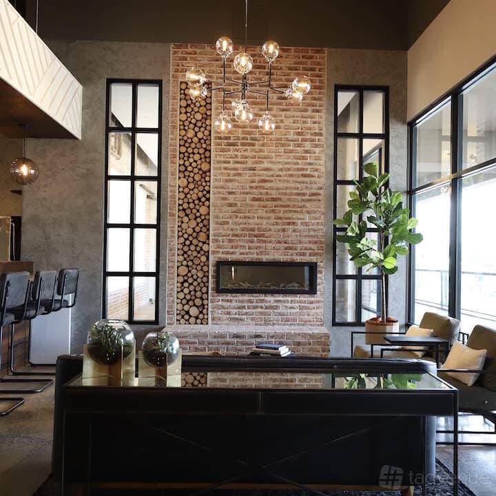 The Factory is a boardroom space seating up to 16 people. Featuring exposed brick walls, copper piping accents, and floor-to-ceiling windows with views of the Perimeter Mall area, it offers an intimate setting for executive meetings, strategy sessions, and innovation workshops.