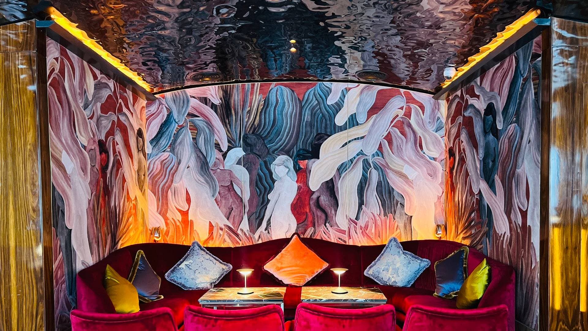 The room itself does a lot of work. Deep blue walls, colourful artwork, plush dark leather banquettes, refined table settings, and soft candle lighting make it feel cosy without being dim or stuffy. It works as well for a relaxed family dinner as it does for something more intimate. The space is kept to a notably high standard throughout.