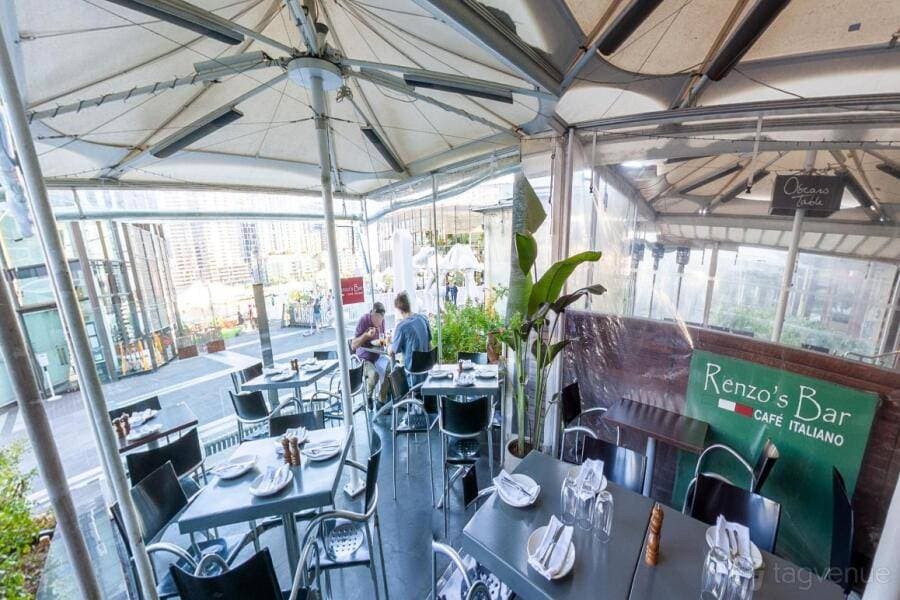 Le Bar Renzos est situé le long de la Promenade de Newquay dans le quartier des Docklands à Victoria, Melbourne. L'établissement propose un cadre de bar et de restaurant dans un quartier en bord de mer.