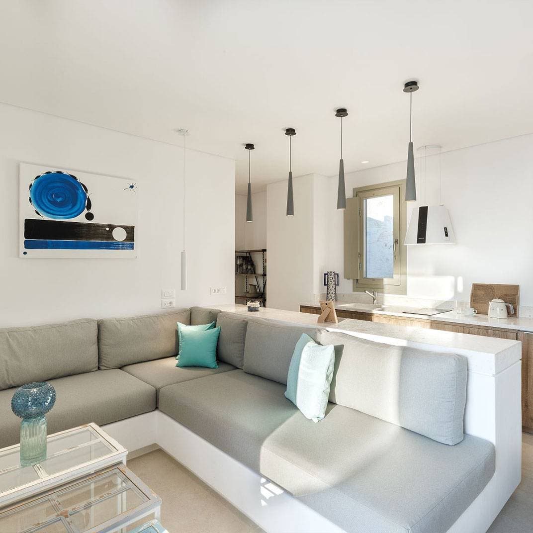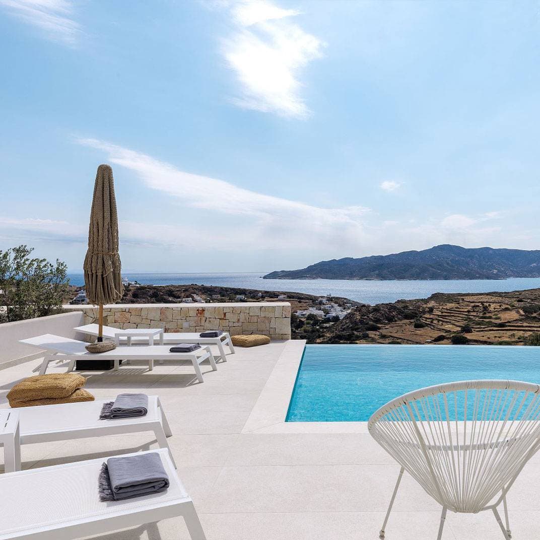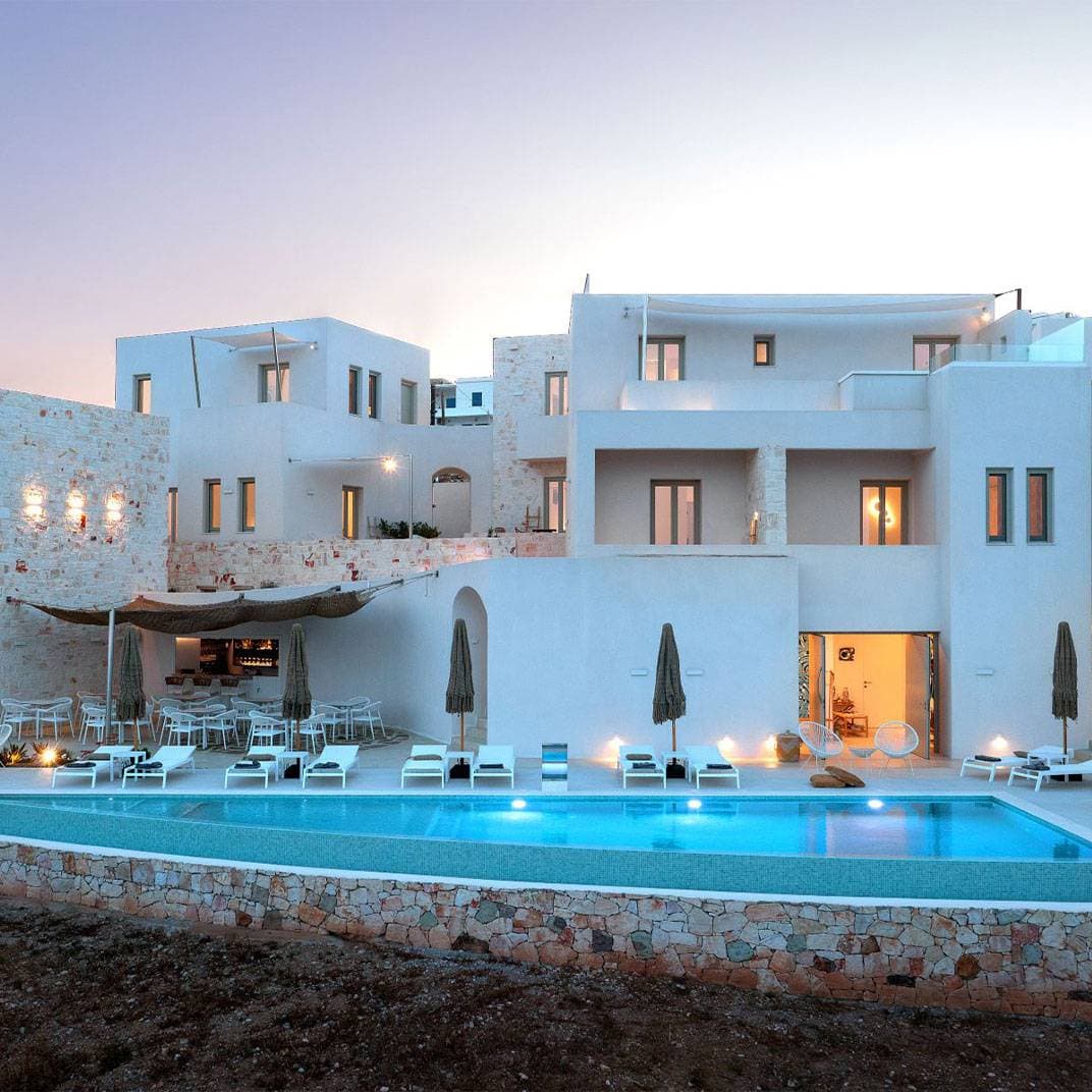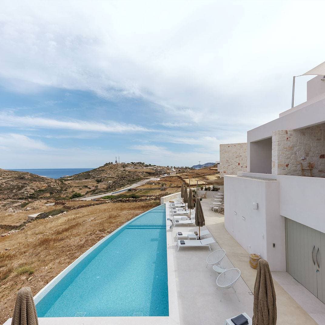L'Anemolethe Suites Hotel Kimolos offre un refuge serein sur la côte rocheuse de Kimolos, une île calme et moins connue des Cyclades. L'architecture traditionnelle blanchie à la chaux de l'hôtel se marie parfaitement avec des intérieurs minimalistes et lumineux, chacun disposant d'une terrasse privée avec une vue imprenable sur la mer. Certaines suites comprennent des bains à remous privés ou des piscines à débordement, renforçant le sentiment de détente. Les clients peuvent profiter de la piscine extérieure face au paysage infini de l'Égée. Cet hôtel intimiste de 16 chambres est idéal pour les voyageurs en quête de tranquillité et d'élégance discrète.
