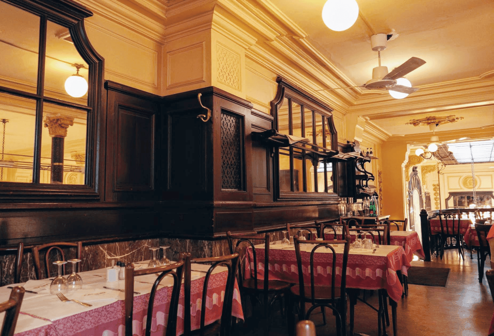 L'immensa sala da pranzo del ristorante è un gioiello storico, ornata con soffitti in vetro illuminato, lampadari appesi, rivestimenti in legno intagliati e dettagli in ottone scintillante. Un mobile utilizzato in passato dai clienti abituali per riporre i loro tovaglioli è ancora presente e la decorazione è stata ufficialmente iscritta nel registro dei monumenti storici nel 1989. Gli ospiti possono anche ammirare un dipinto del 1929 dell'artista Germont, realizzato per saldare i suoi pasti.